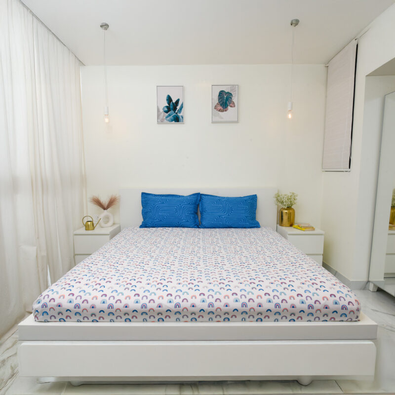 Soft and breathable 100% cotton double bedsheet featuring a vibrant blue rainbow design that adds a colorful and lively touch to your bedroom. Made with 144 thread count for everyday comfort, it is lightweight, durable, and gentle on the skin, and comes with 2 matching pillow covers for a complete and coordinated look.