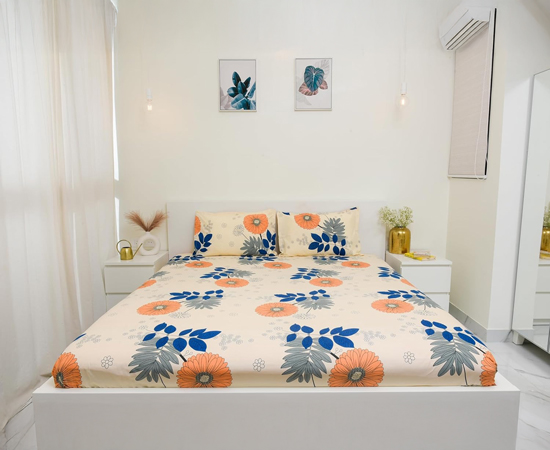 This double bedsheet combo features a vibrant orange and purple color combination with an elegant floral and leaves design, adding a lively and refreshing touch to your bedroom. Made with soft and breathable fabric, it comes with four matching pillow covers for a complete and comfortable sleep experience.
