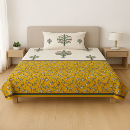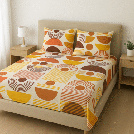 Refresh your space with the Single Marigold Grove Print Bedsheet Set – 144 TC 100% Cotton, a blend of style and comfort. Its bold geometric marigold design adds charm to modern bedrooms .Made from soft, breathable cotton for a cozy sleep every night.