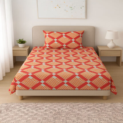 Elevate your bedroom décor with the Single Red Ornate Harmony Print Bedsheet Set – 144 TC 100% Cotton, blending timeless elegance with everyday comfort. The intricate geometric pattern in rich red tones adds a stylish, artistic flair to modern interiors. Made from 100% cotton with a soft 144 thread count finish, it offers breathability and lasting comfort for a peaceful night’s rest.