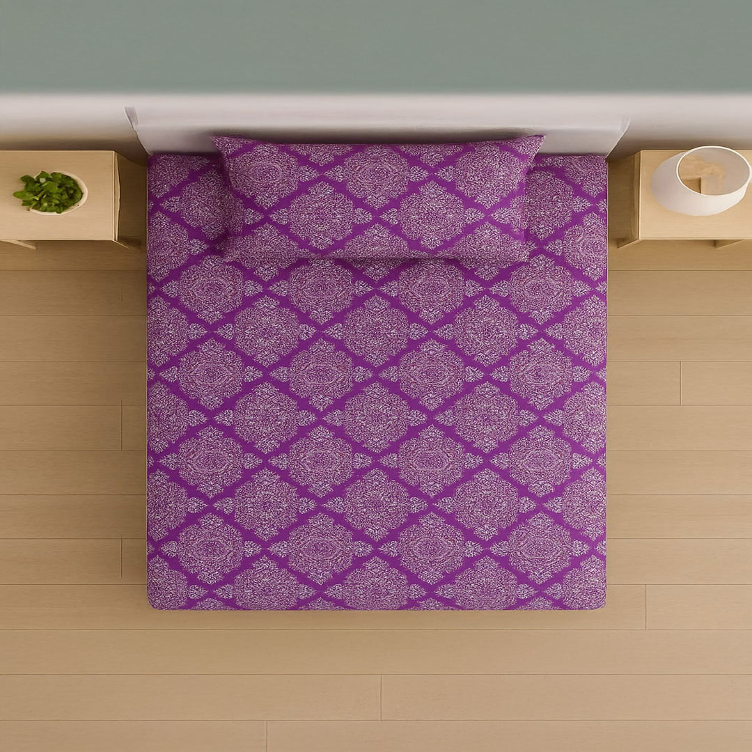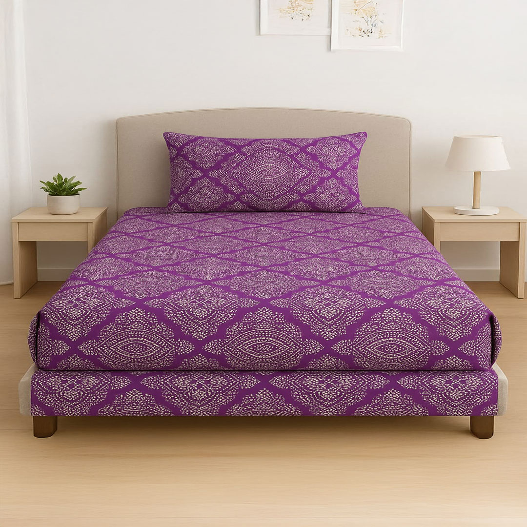Add a modern flair to your space with the Single Purple Dot Diamond Print Bedsheets Set – 144 TC 100% Cotton. Made from pure cotton, it offers a soft, breathable feel for a restful sleep. The unique dot and diamond geometric print in rich purple tones adds a stylish touch to any bedroom.