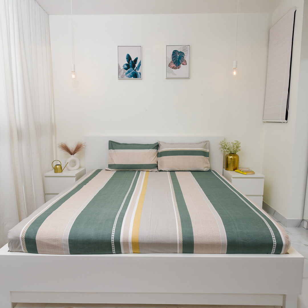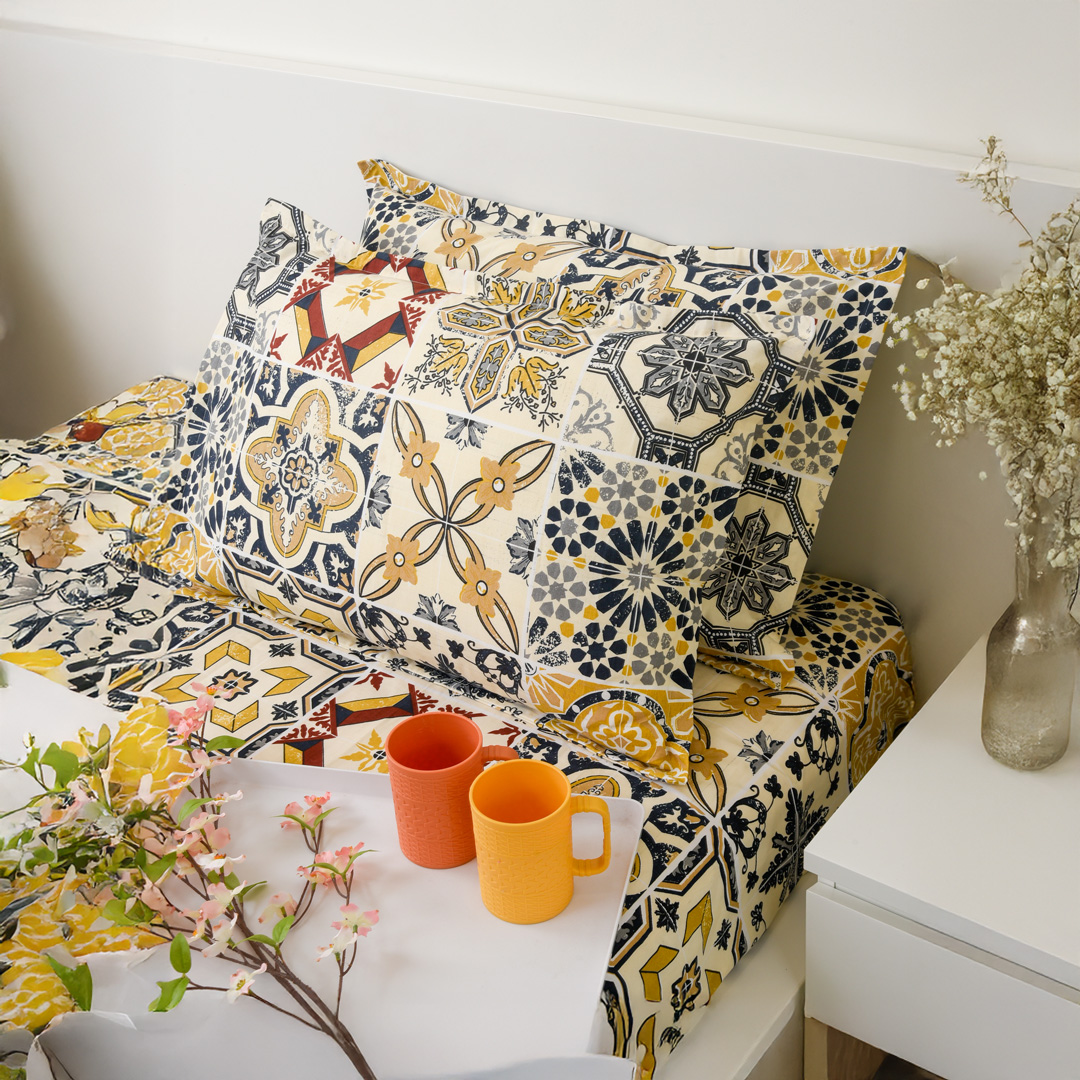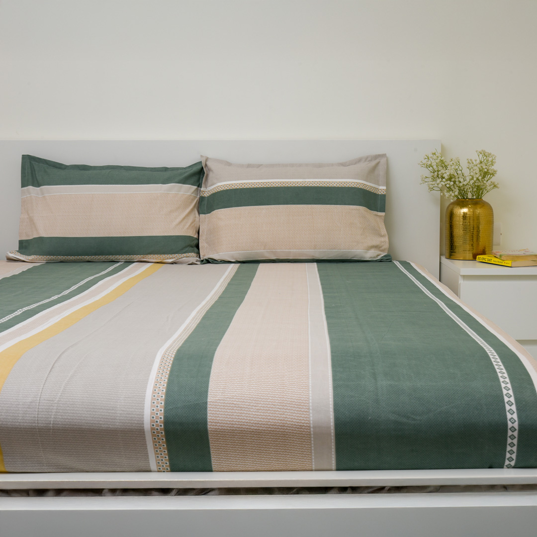 Featuring a warm combination of brown and off white tones with a modern geometric and lines design, this bedsheet set adds a clean and contemporary touch to your bedroom. Its minimal yet stylish look blends effortlessly with any interior, making it perfect for everyday use, guest rooms, or modern spaces. Crafted from polycotton fabric, it ensures breathable comfort and a smooth, soft feel for a restful sleep in every season.