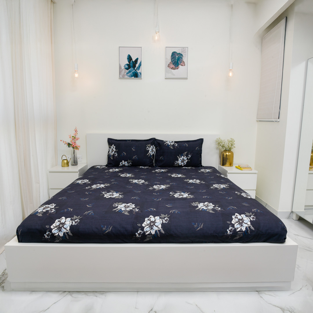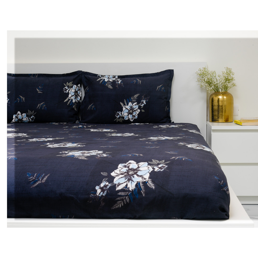 Featuring a refreshing combination of navy blue and grey tones with a unique geometric and floral design, this bedsheet set adds a modern yet elegant touch to your bedroom. Its stylish look blends effortlessly with any interior, making it perfect for everyday use, guest rooms, or contemporary spaces. Crafted from polycotton fabric, it ensures breathable comfort and a smooth, soft feel for a restful sleep in every season.