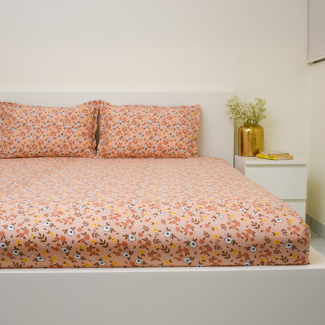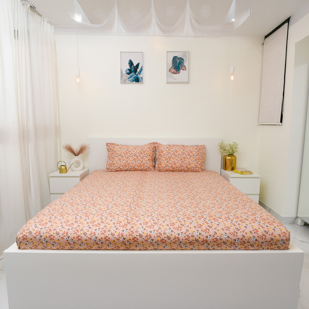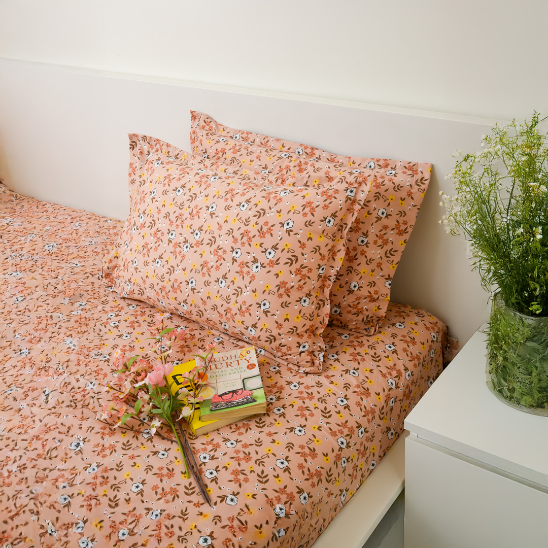 Soft and breathable 100% cotton single bedsheet featuring a beautiful pink floral design that adds a fresh and elegant touch to your bedroom. Made with 144 thread count for everyday comfort, it is lightweight, durable, and gentle on the skin, and comes with 1 matching pillow cover for a complete and coordinated look.