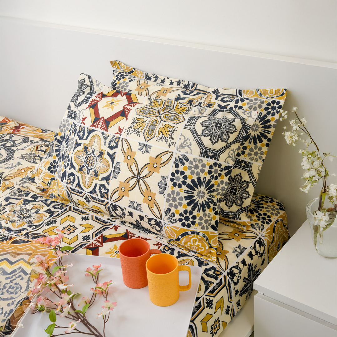Soft and breathable 100% cotton single bedsheet featuring a vibrant orange diamond design that adds a bold and modern touch to your bedroom. Made with 144 thread count for everyday comfort, it is lightweight, durable, and gentle on the skin, and comes with 1 matching pillow cover for a complete and coordinated look.