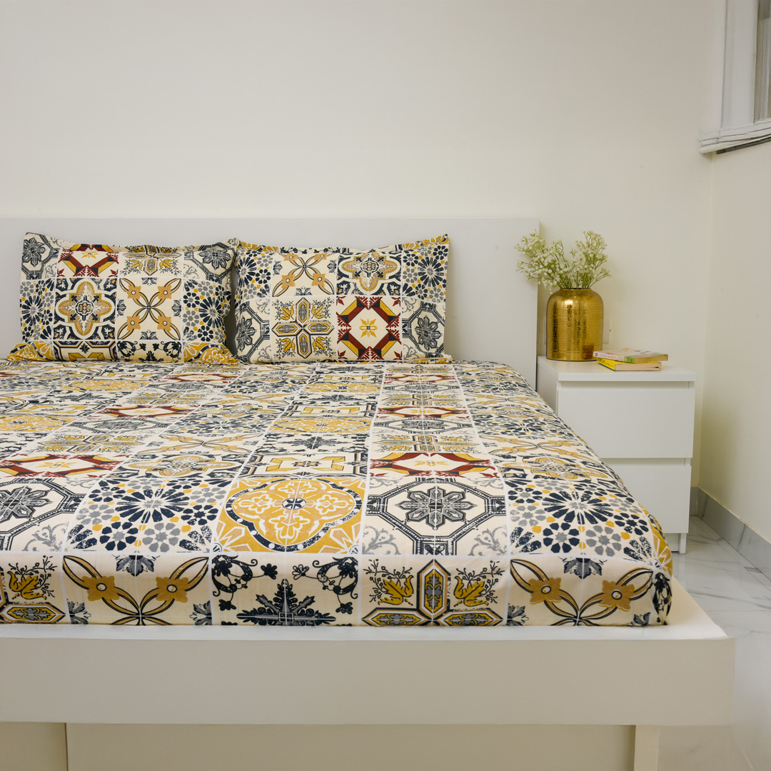 Soft and durable polycotton double bedsheet featuring a stylish brown tile design that adds a warm and contemporary touch to your bedroom. Made with 140 GSM fabric, it is lightweight, breathable, wrinkle-resistant, and easy to maintain, and comes with 2 matching pillow covers for a complete and coordinated look.