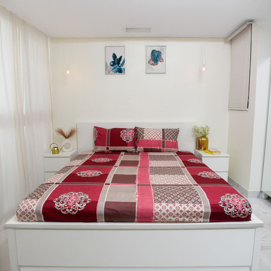 Featuring a bold and vibrant red tone, this bedsheet set adds a striking and stylish touch to your bedroom. Its minimal yet elegant design blends effortlessly with any interior, making it perfect for everyday use, guest rooms, or modern spaces. Crafted from polycotton fabric, it ensures breathable comfort and a smooth, soft feel for a restful sleep in every season.