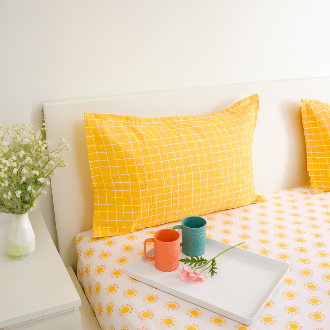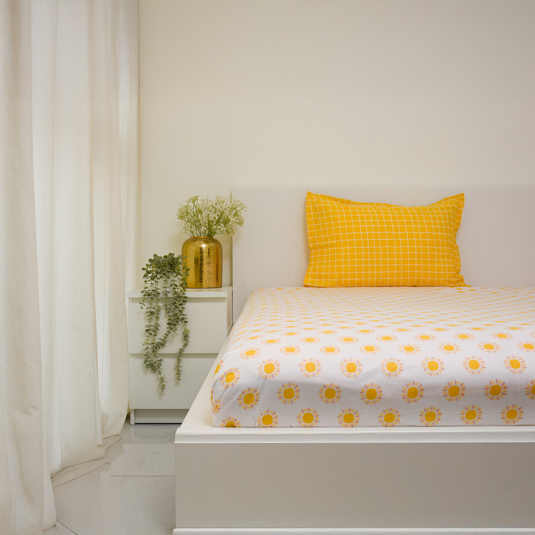Soft and breathable 100% cotton single bedsheet featuring a vibrant yellow sun & retro design that adds a bright and cheerful touch to your bedroom. Made with 144 thread count for everyday comfort, it is lightweight, durable, and gentle on the skin, and comes with 1 matching pillow cover for a complete and coordinated look.