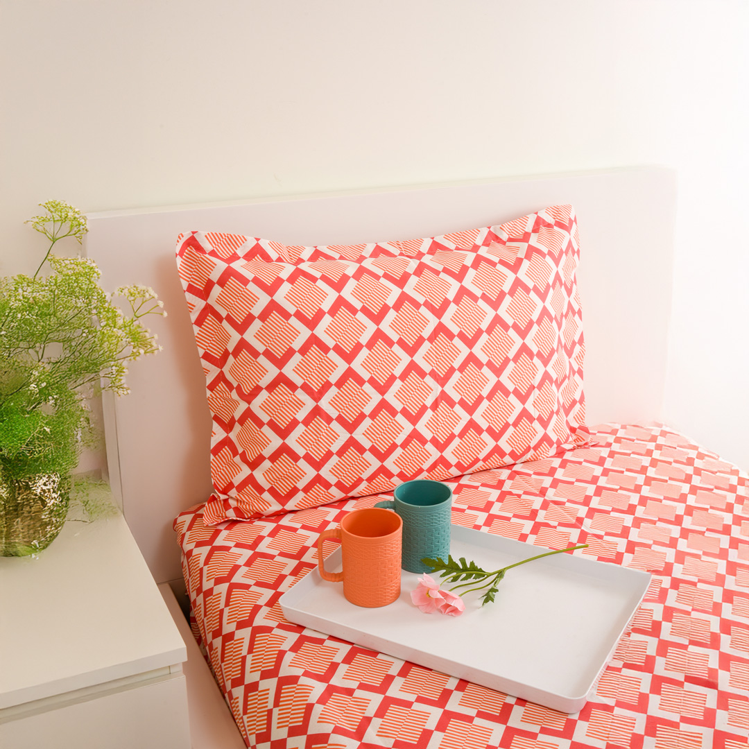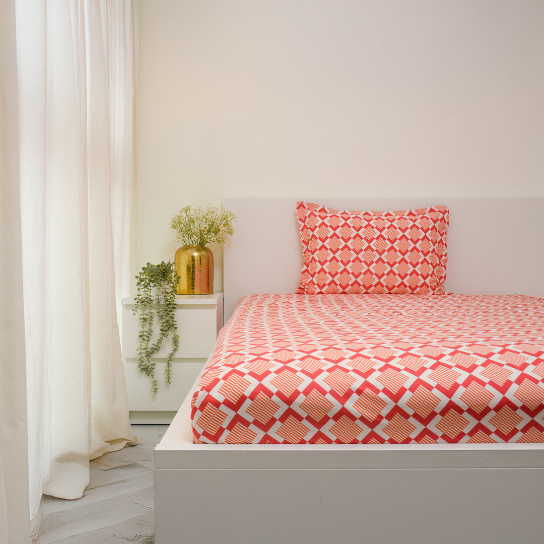 Soft and breathable 100% cotton single bedsheet featuring a red & white geometric design that adds a bold and modern touch to your bedroom. Comes with 1 matching pillow cover for a complete and comfortable setup.