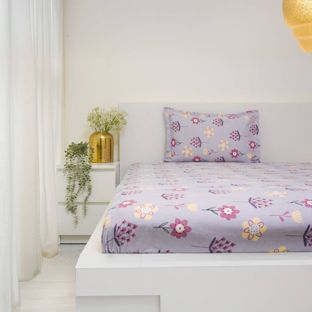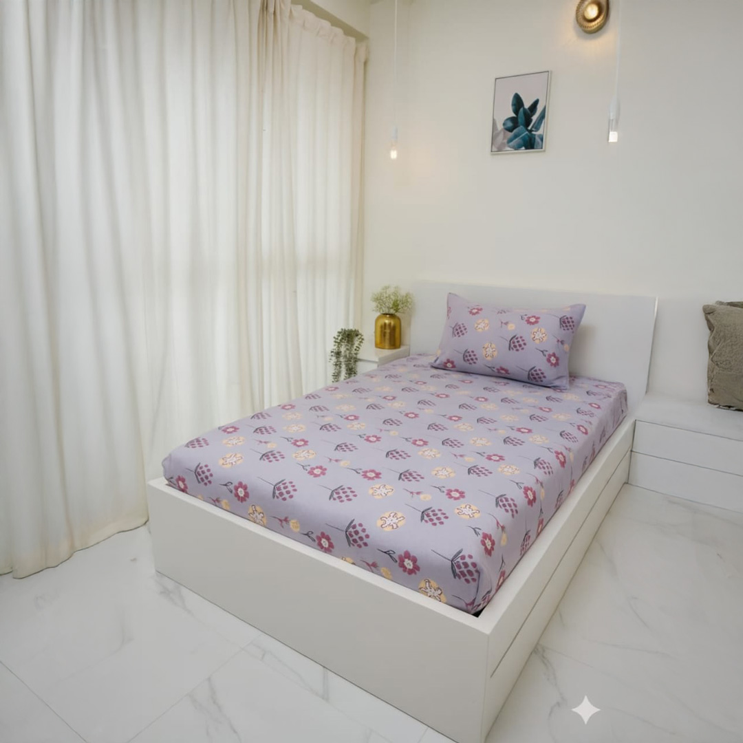 Soft and durable polycotton single bedsheet featuring an elegant light grey floral design that adds a subtle and sophisticated touch to your bedroom. Made with 140 GSM micro fabric, it is lightweight, breathable, wrinkle-resistant, and easy to maintain, and comes with 1 matching pillow cover for a complete and coordinated look.