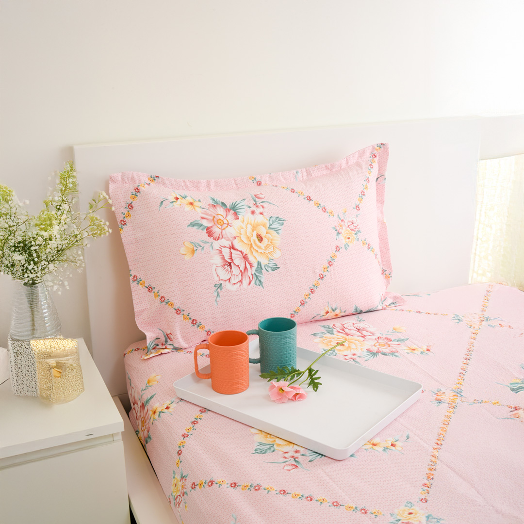 Soft and durable polycotton single bedsheet combo featuring a vibrant pink & blue floral design that adds a fresh and stylish touch to your bedroom. Made with 140 GSM micro fabric, it is lightweight, breathable, wrinkle-resistant, and easy to maintain, and comes with 2 matching pillow covers for a complete and coordinated look.