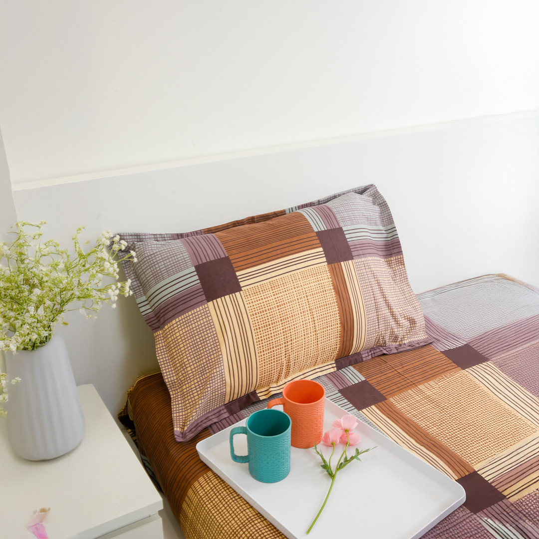 Soft and breathable 100% cotton single bedsheet featuring a stylish purple dots design that adds a vibrant and modern touch to your bedroom. Made with 144 thread count for everyday comfort, it is lightweight, durable, and gentle on the skin, and comes with 1 matching pillow cover for a complete and coordinated look.