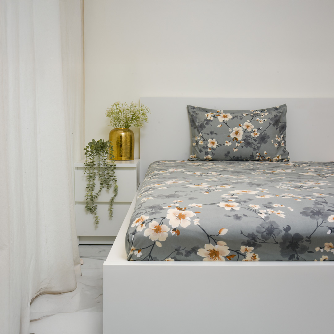 Soft and durable polycotton single bedsheet featuring an elegant light grey floral design that adds a subtle and sophisticated touch to your bedroom. Made with 140 GSM micro fabric, it is lightweight, breathable, wrinkle-resistant, and easy to maintain, and comes with 1 matching pillow cover for a complete and coordinated look.
