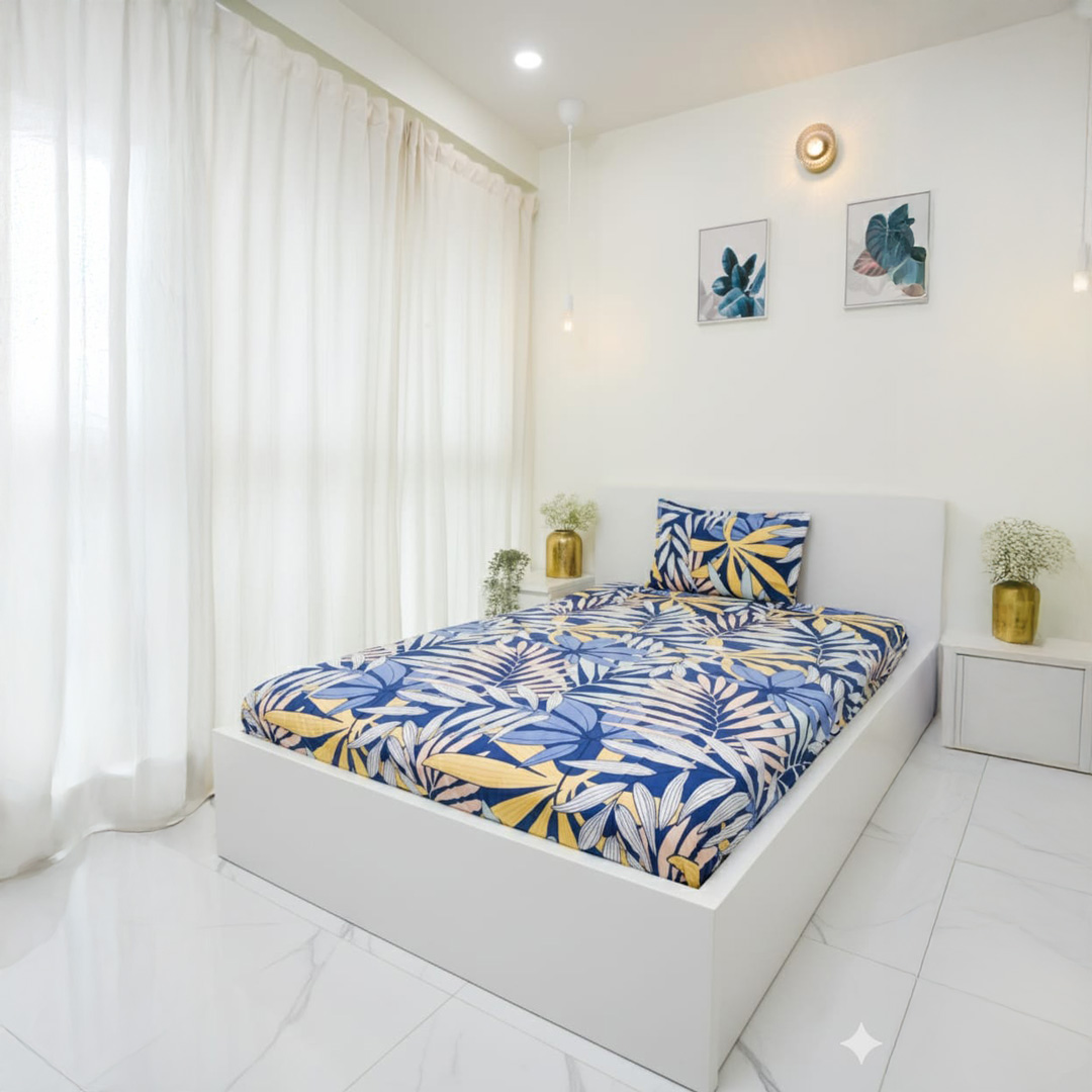 Soft and durable polycotton single bedsheet featuring a stylish blue wave design that adds a calm and modern touch to your bedroom. Made with 140 GSM micro fabric, it is lightweight, breathable, wrinkle-resistant, and easy to maintain, and comes with 1 matching pillow cover for a complete and coordinated look.