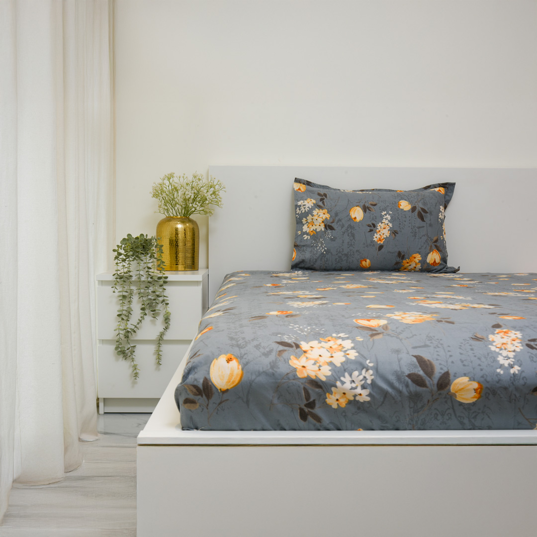 Soft and breathable 100% cotton single bedsheet featuring a beautiful yellow floral design that adds a bright and elegant touch to your bedroom. Made with 144 thread count for everyday comfort, it is lightweight, durable, and gentle on the skin, and comes with 1 matching pillow cover for a complete and coordinated look.