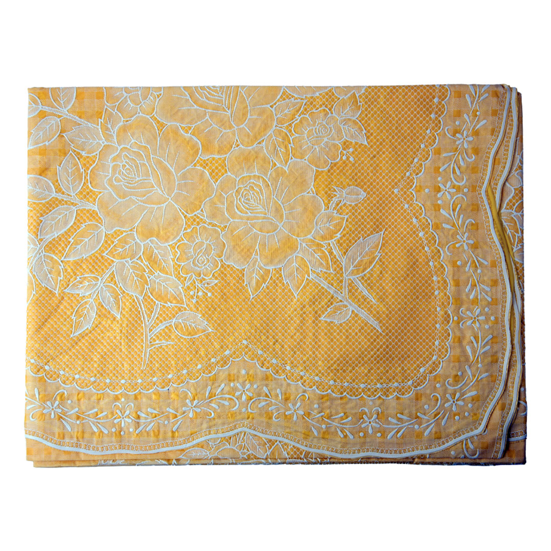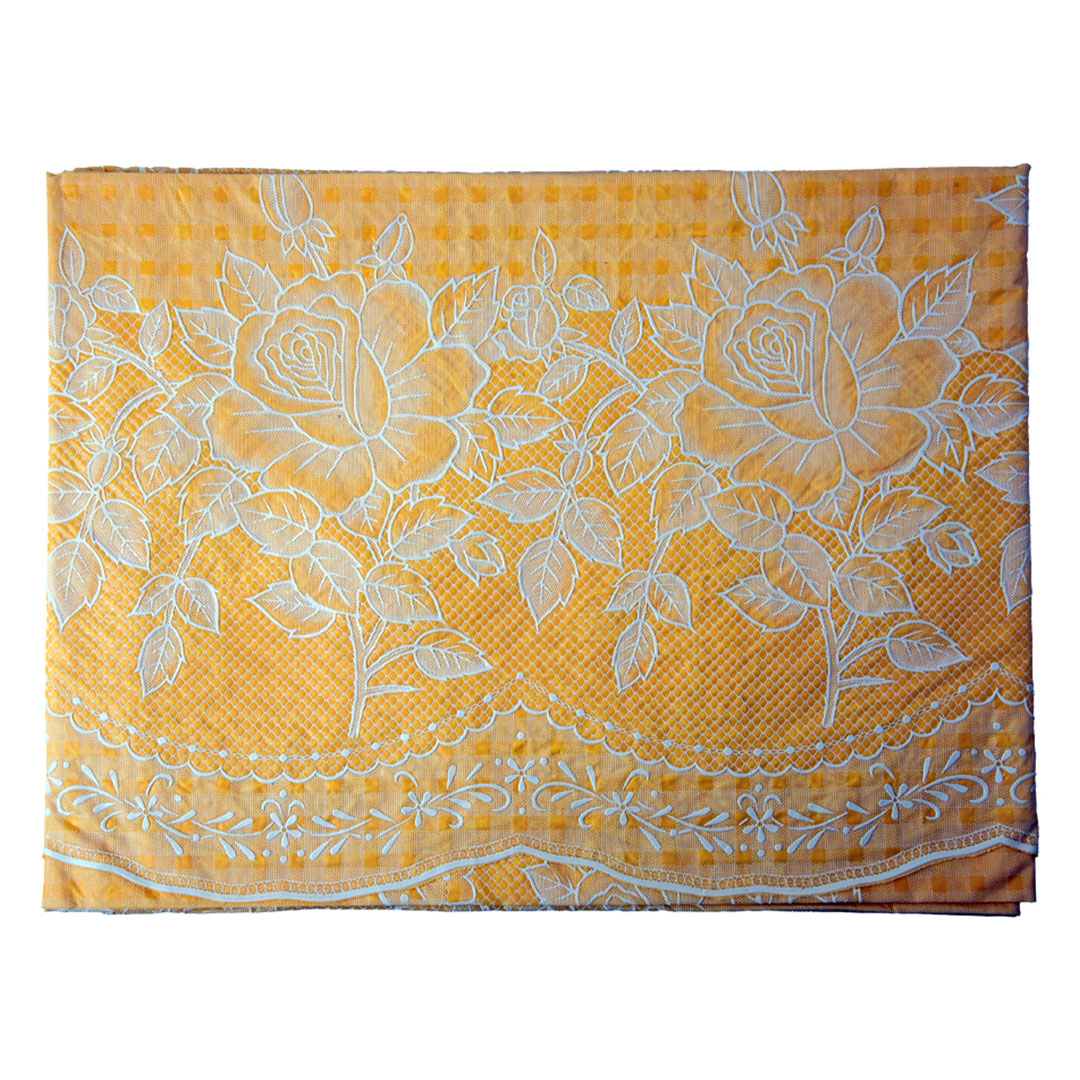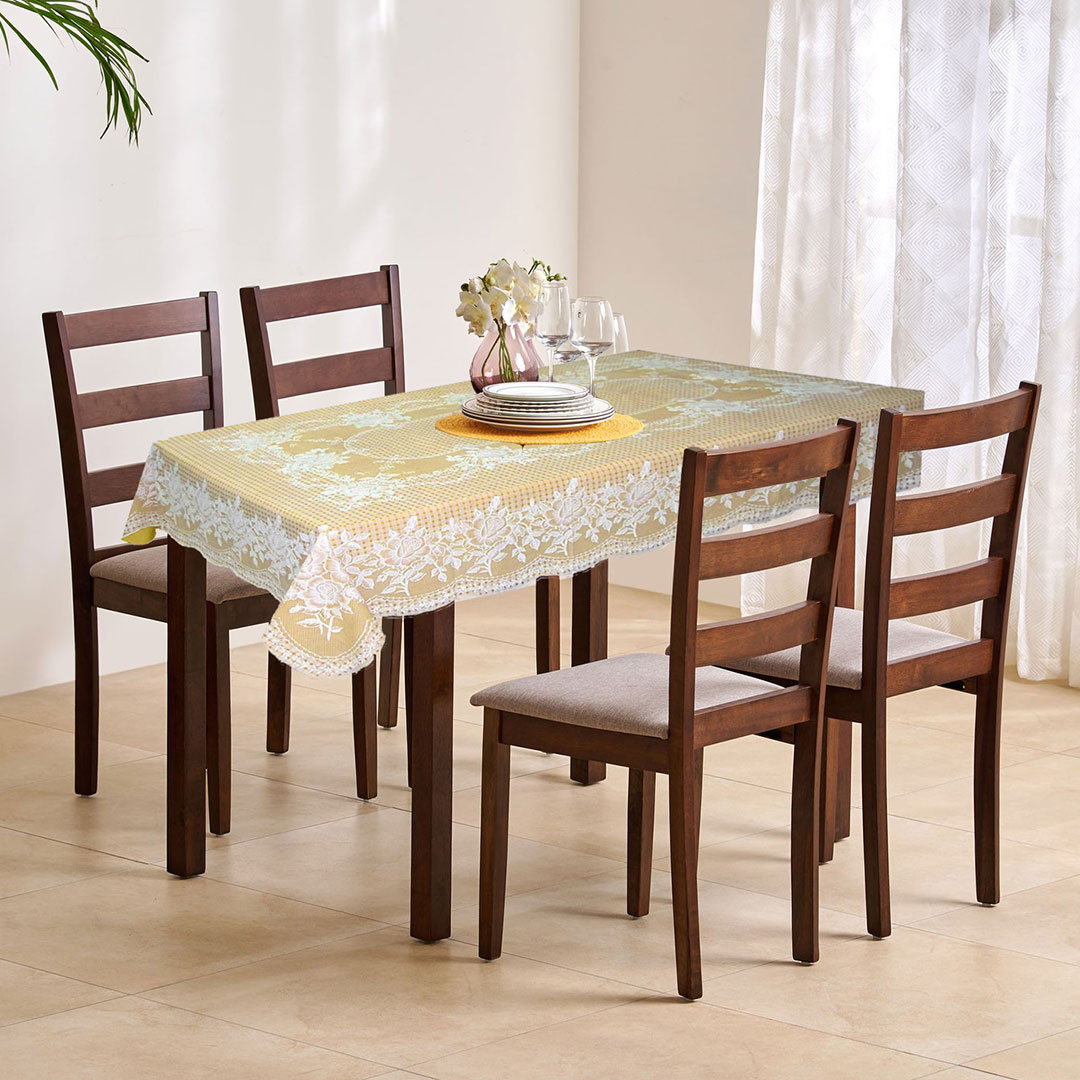 Elegant gold vinyl table cover with a stylish blossom design for a premium dining look. Protects your table from spills, stains, and scratches. Perfect for 4-seater tables with easy cleaning and maintenance