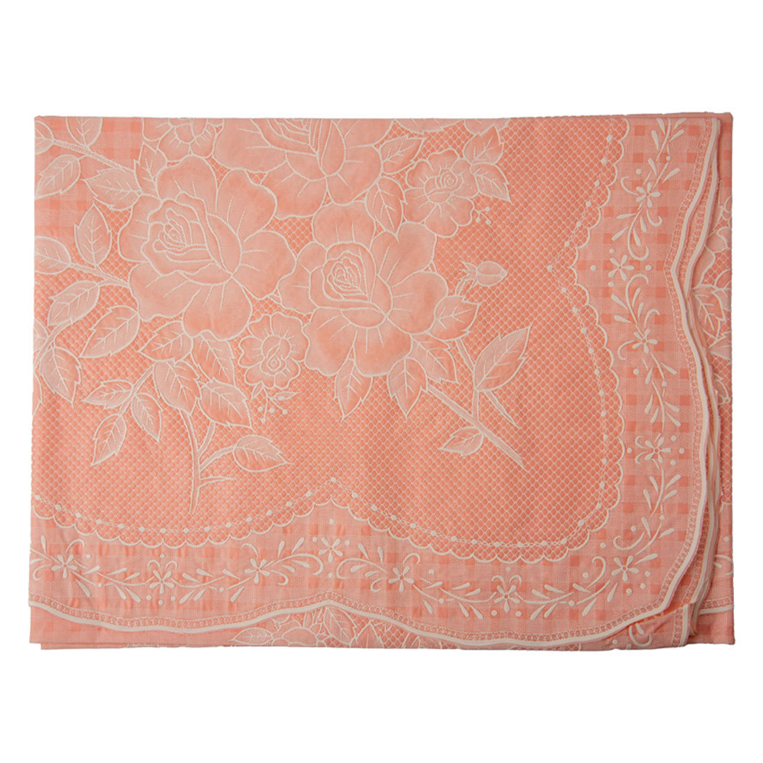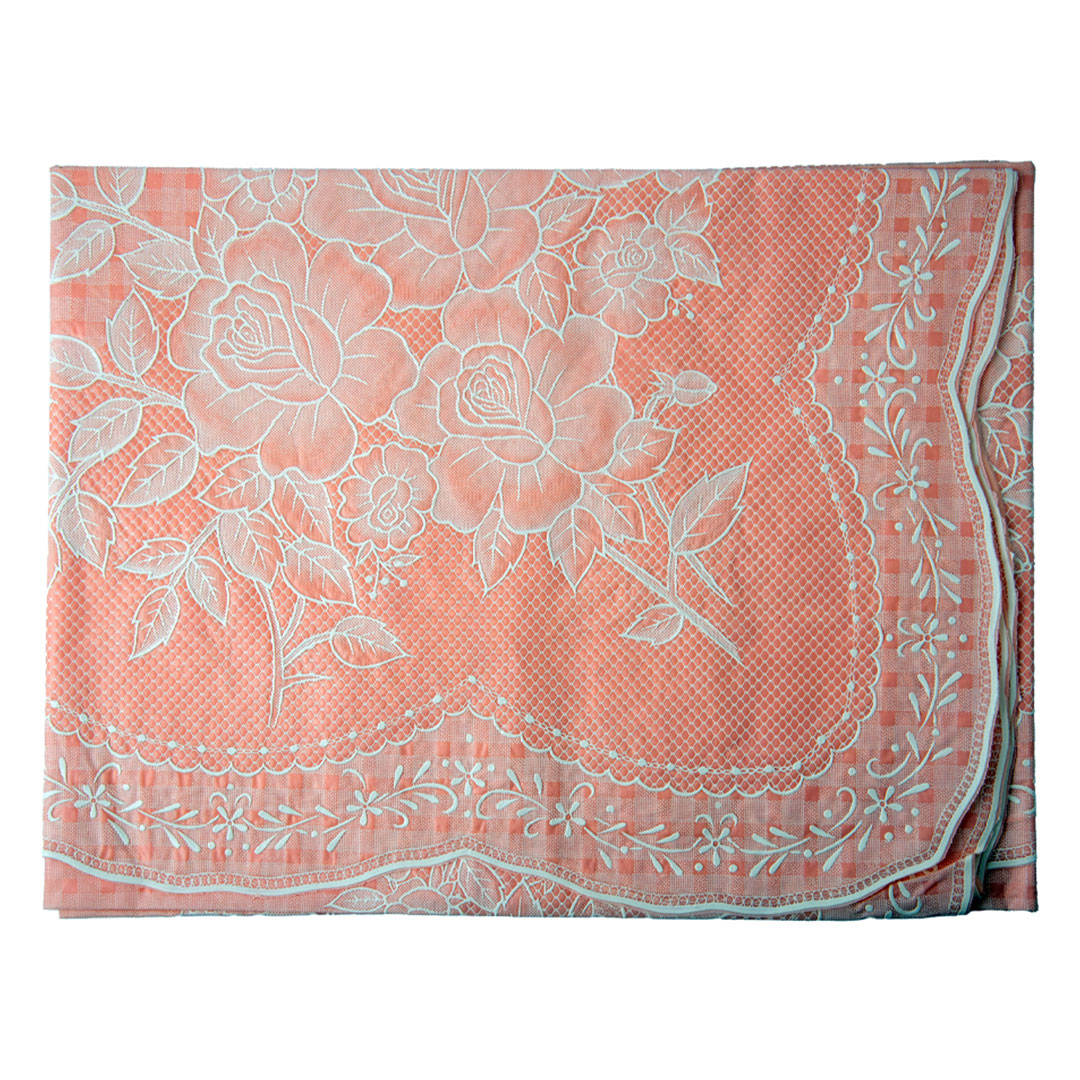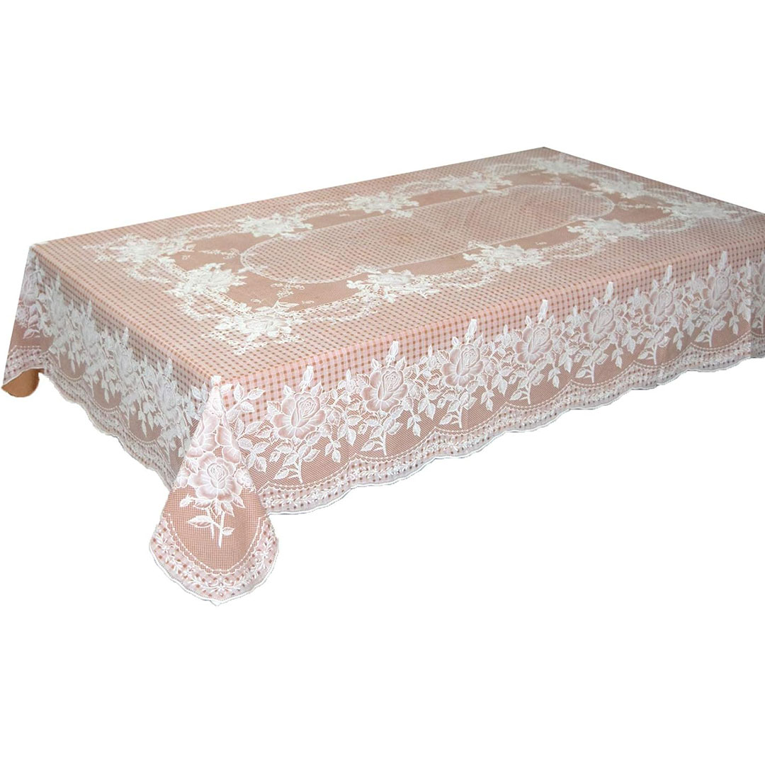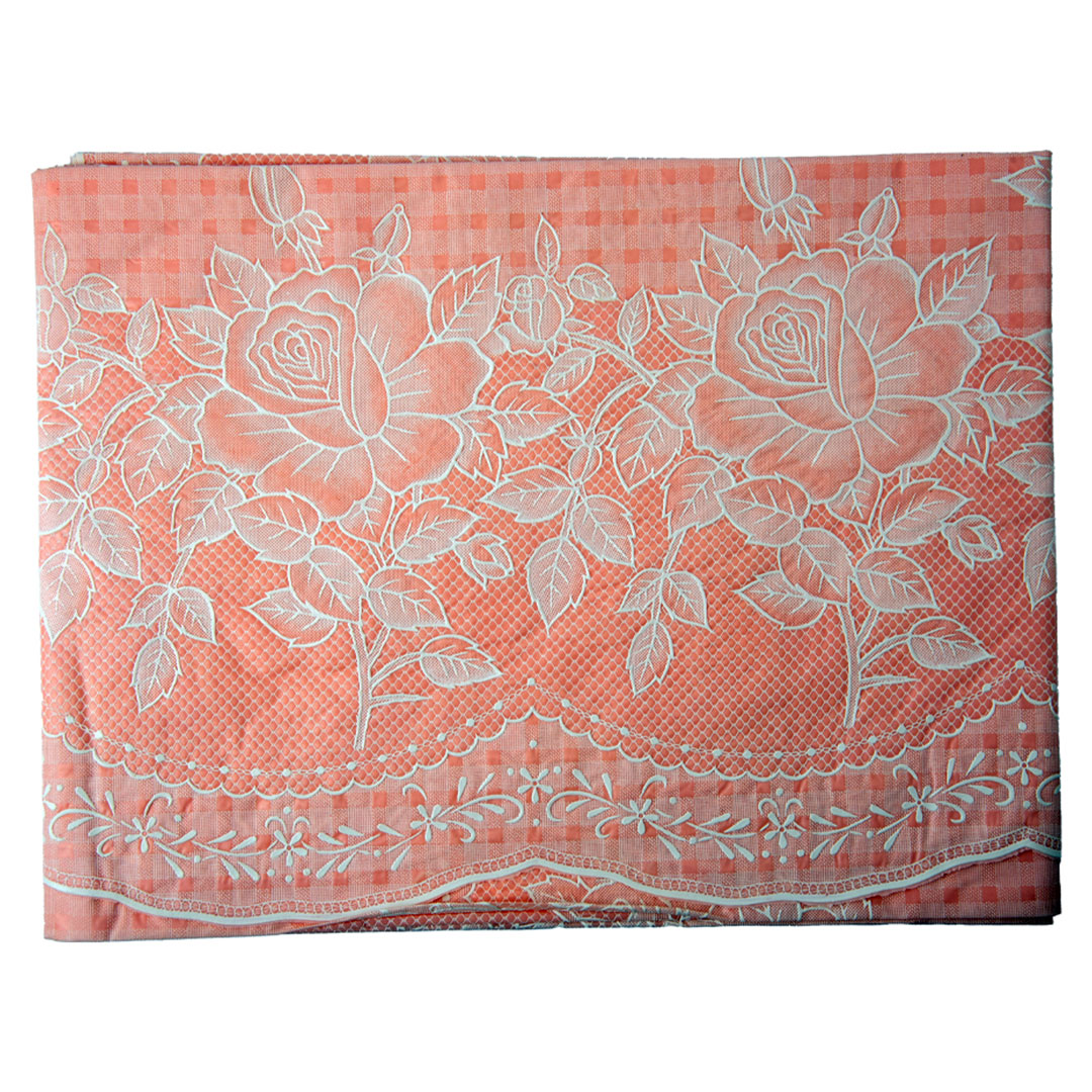 Elegant peach-colored vinyl table cover with a beautiful blossom design. Protects your table from spills, stains, and scratches. Perfect for 4-seater dining tables with easy cleaning and maintenance.